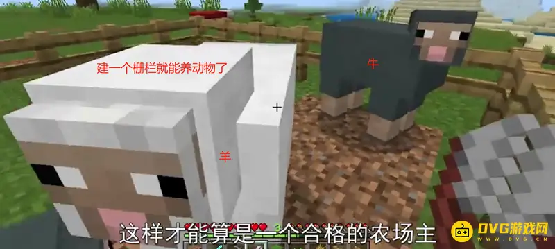 三、除了日常种地,我们还要养殖动物,牛羊鸡等动物都可以为我们提供稳定的食物和合成材料,在野外看到动物的时候要把它抓到栅栏里养着。