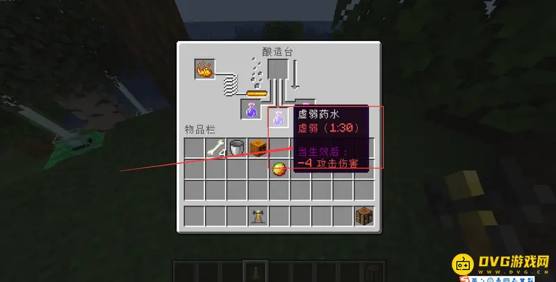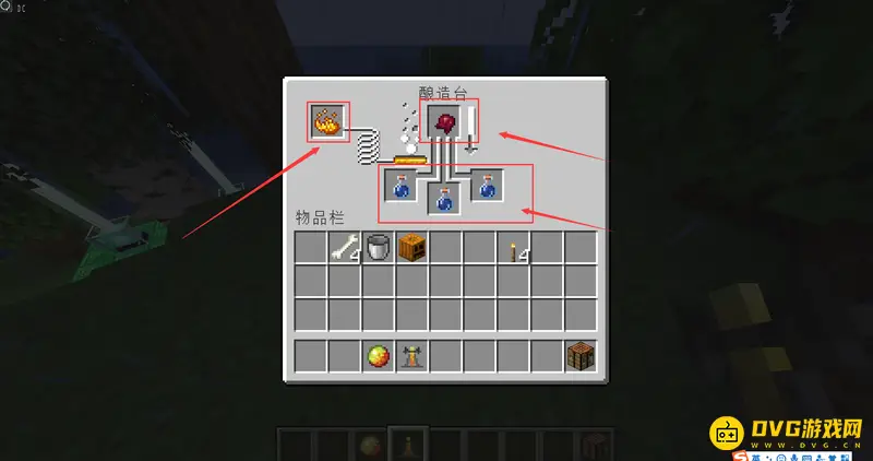 最左边的格子放入烈焰粉作为燃料,顶部的格子放入药物,例如下图的发酵蛛眼: