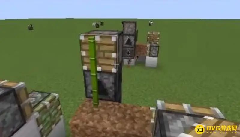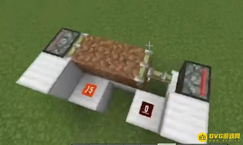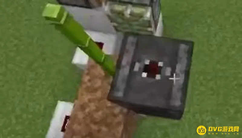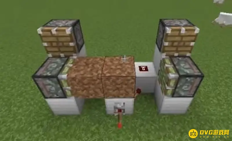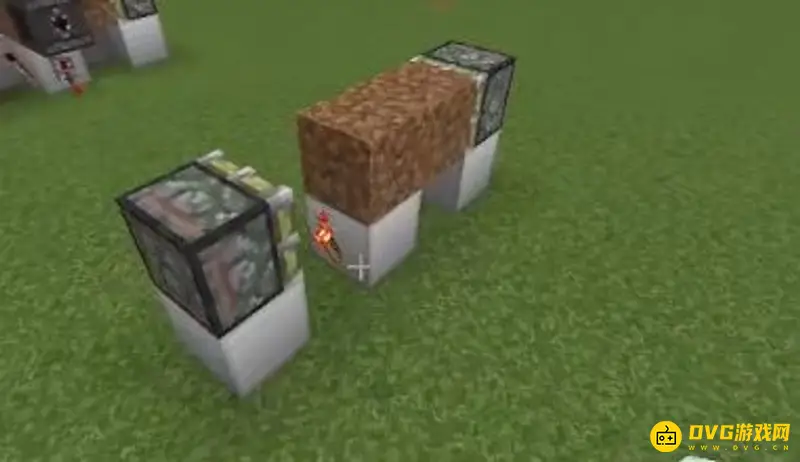 2、上边放两个泥土,然后再放一个粘性活塞,另一端也布置一个方块和一个粘性活塞。