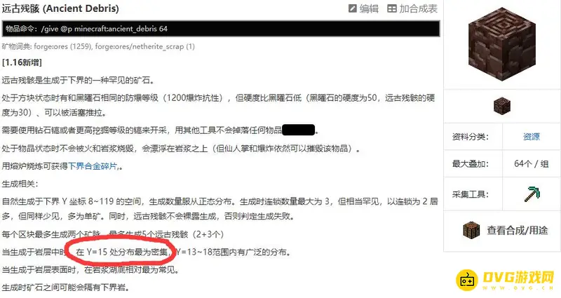 2,然后找到下界合金的原始方块,也就是远古残骸的相关说明,在15层最多。