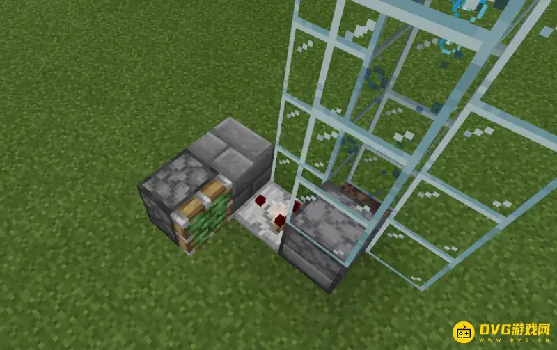 4、现在开始制作控制发射器发射物品的装置。当发射器中有物品的时候,向发射器输入一个红石信号。放上一个红石比较器,注意比较器朝向。