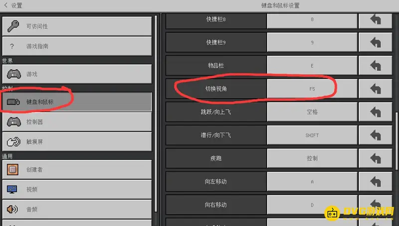 2,然后点击左侧键盘和鼠标,就可以在右侧发现,切换视角按键为F5了。