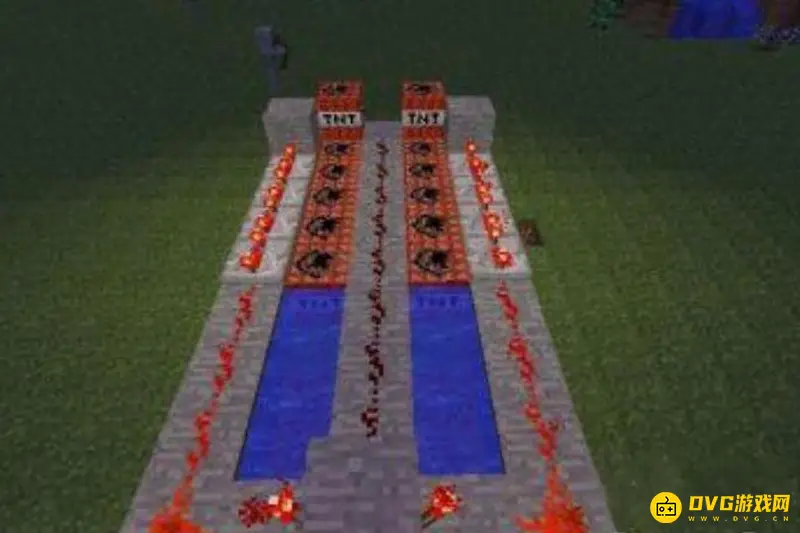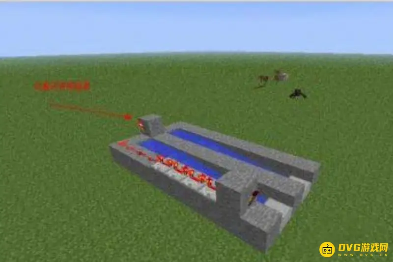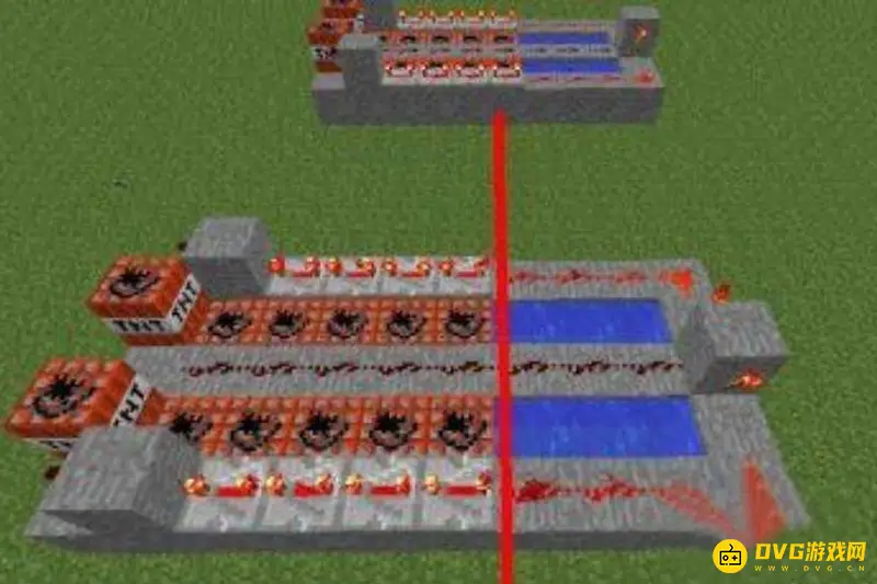 3、左边一侧放上一组红石(红石箭头处),作为点燃按推动力。记得在左侧墙壁前段放上一段不导电的物品。