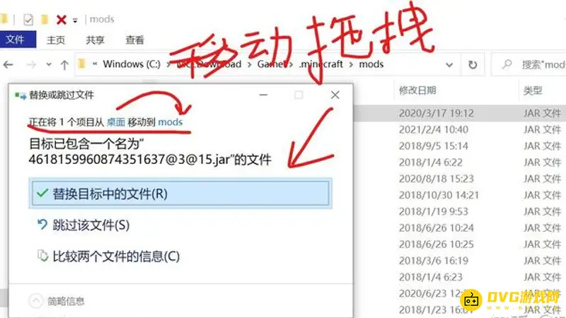 8、在游戏完成启动之前将你已经命名完成的国际版mod拖拽到这个路径(此电脑——C盘——MCLDownload——Game——.minecraft——mod)的文件夹里,也就是刚刚让你们打开的,并且选择替换该文件。