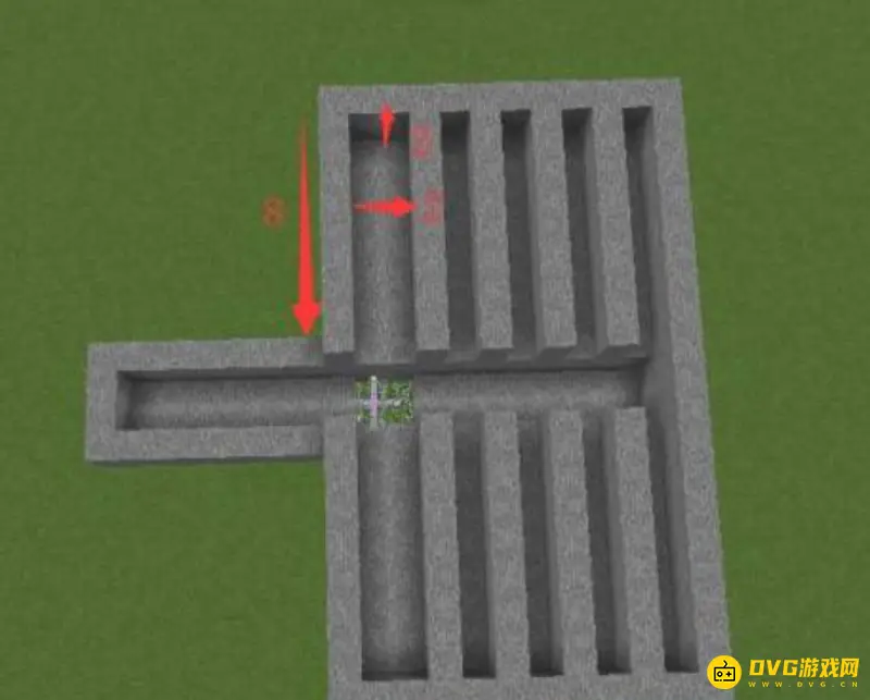 8.回到刷怪塔顶部,将纵向的两边也像横向的那样做一个长8格宽2格高2格的凹形区域。