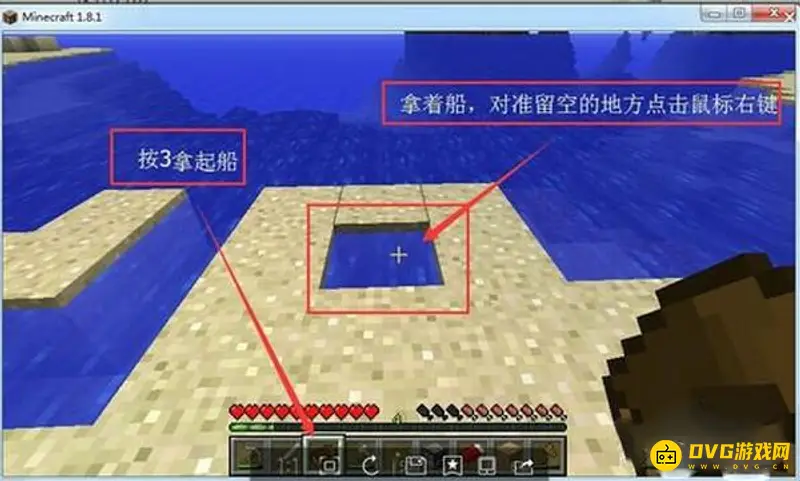 1. 找一个浅滩边,把砂子砌成图中形状后,我的船是放在第3个格子中按下船对应的功能键"3",点击鼠标右键把船放在砂子中间留空的水处!