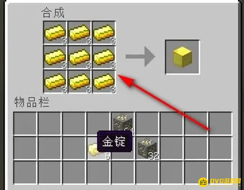 3、将金矿烧成金锭,再合成金块,9个金锭和一个金块。
