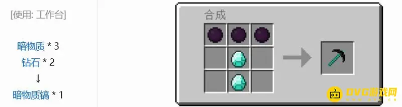 制作暗物质镐需要使用三个暗物质和两颗钻石,暗物质工具不能通过附魔台和铁砧附魔。玩家可以在地下挖矿得到钻石,不过需要挖到地底很深的地方,大概位置要接近岩浆。暗物质需要用8个永恒燃料和一个钻石块进行合成,首次得到暗物质时能够得到一个万物归于物质的成就。