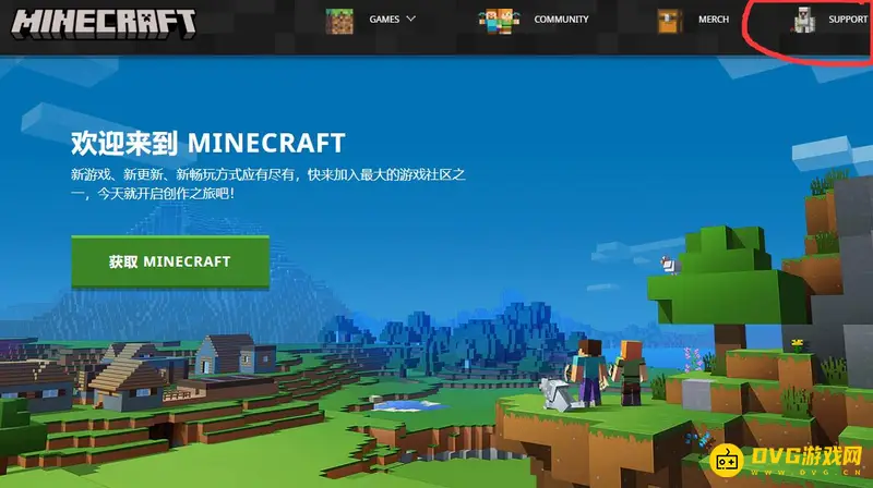 1,首先我们进入我的世界官网,点击右上角SUPPORT查看说明。