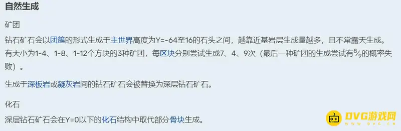 在我的世界里,钻石主要以两种形式存在。矿团:钻石矿石会以团簇的形式生成于主世界高度为Y=-64至16的石头之间,越靠近基岩层生成量越多,且不常露天生成。有大小为1-4、1-8、1-12个方块的3种矿团,每区块分别尝试生成7、4、9次(最后一种矿团的生成尝试有8/9的概率失败)。生成于深板岩或凝灰岩间的钻石矿石会被替换为深层钻石矿石。化石:深层钻石矿石会在Y=0以下的化石结构中取代部分骨块生成。