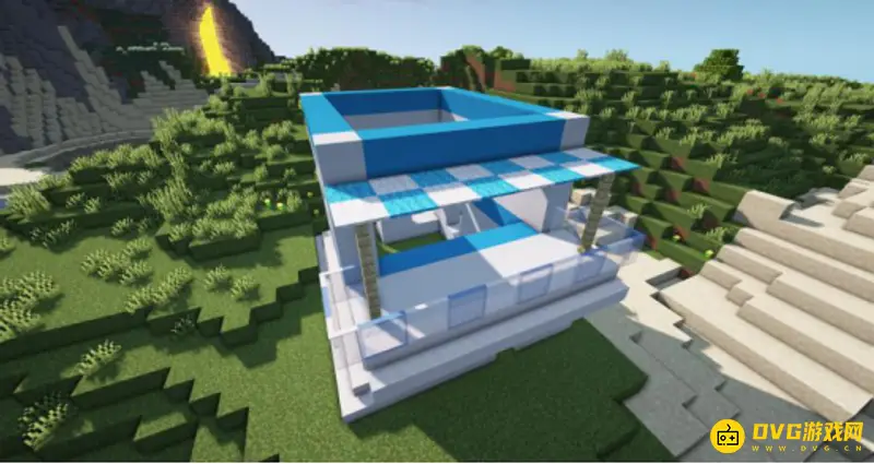10、最后就是房子的顶部,分别用淡蓝色混凝土、白色混凝土、淡蓝色染色玻璃、萤石灯/海晶灯搭建