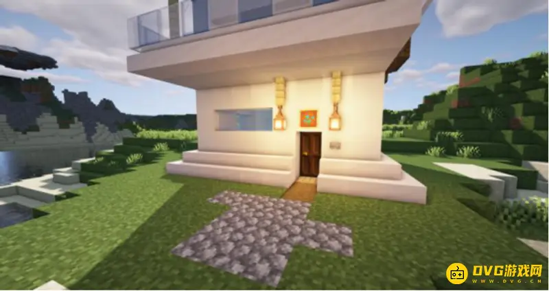 11、完善一下墙壁留下来的空缺,用淡蓝色染色玻璃放置作为窗户,门口可以放一些灯笼提升亮度,建造完成