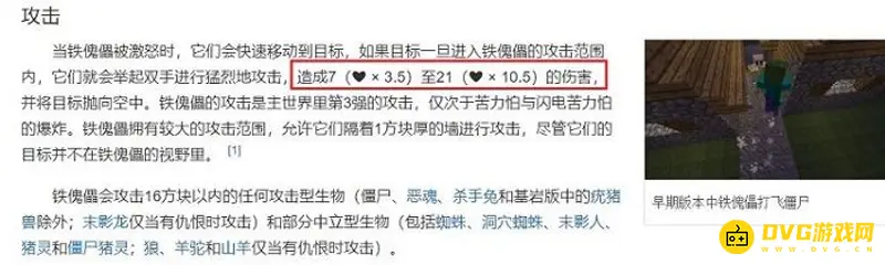 我的世界游戏中铁傀儡的伤害为7(❤ × 3.5)至21(❤ × 10.5),铁傀儡拥有较大的攻击范围,允许它们隔着1方块厚的墙进行攻击,尽管它们的目标并不在铁傀儡的视野里,并且会攻击16方块以内的任何攻击型生物。