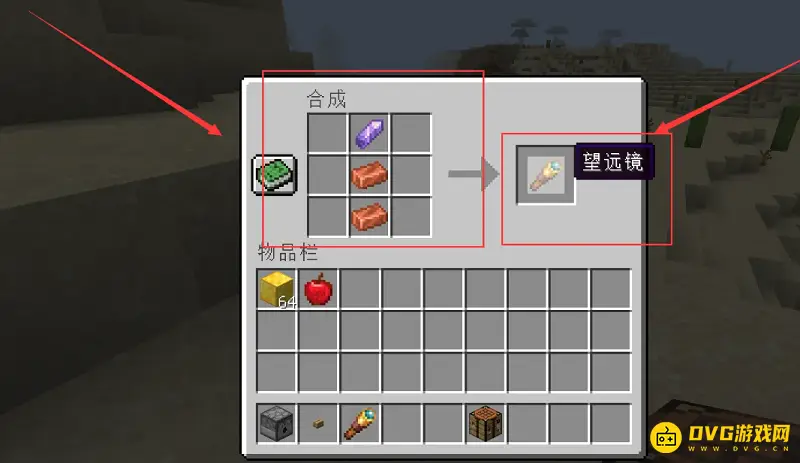 1.首先进入游戏后,先在工作台用两个铜锭和一个紫水晶碎片合成望远镜。
