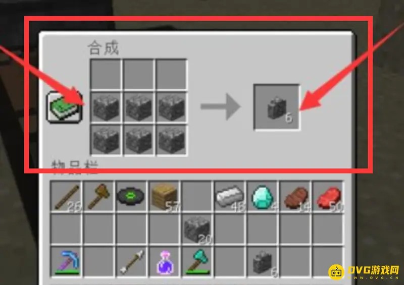 3、第三步,将挖到的【圆石】放到【工作台】中,方法是一排3个圆石,一共放两排,可以合成【侏罗纪石膏粉】,如下图所示: