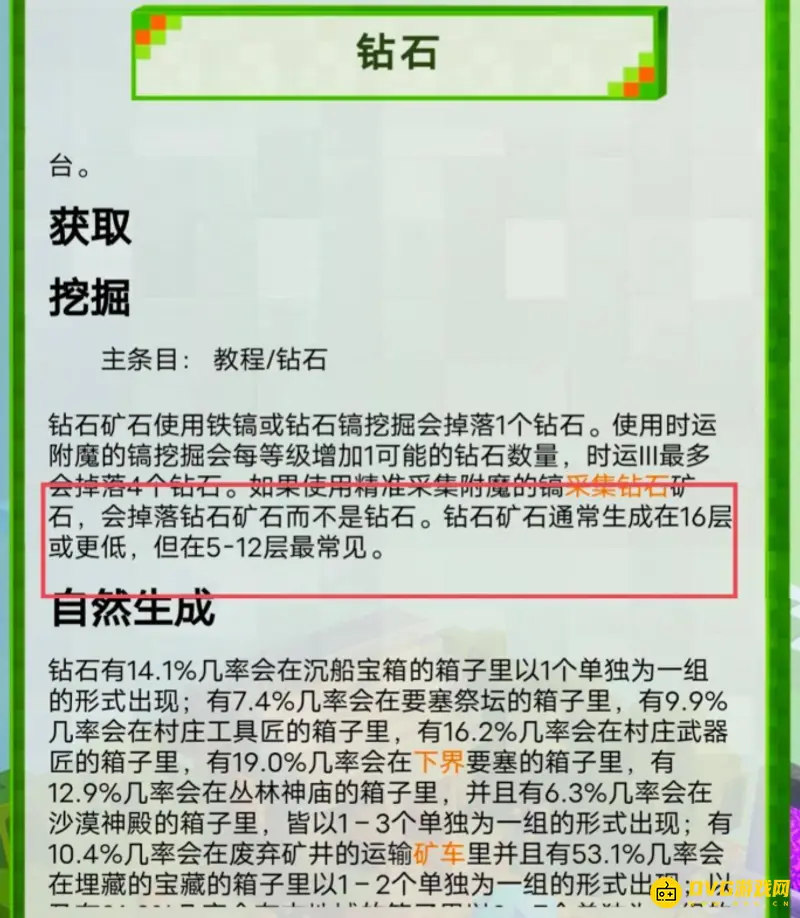 在我的世界游戏当中,钻石矿石通常生成在16层或更低,但在5-12层最常见。其有46.9%几率会在埋藏的宝藏的箱子里以1个单独为一组的形式出现。