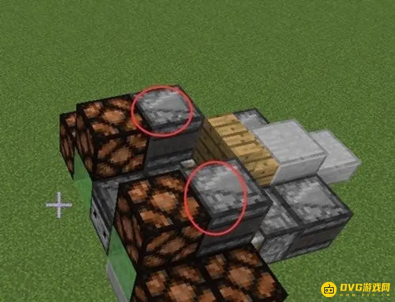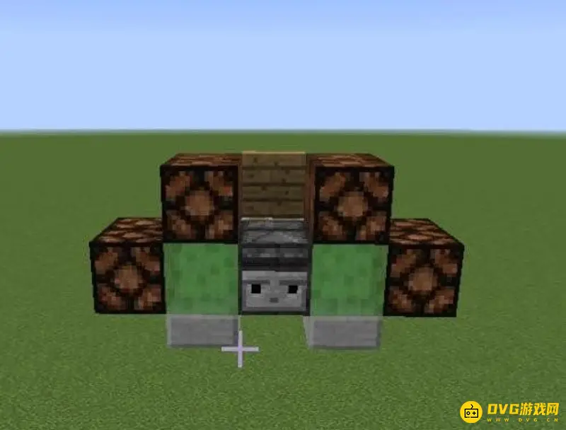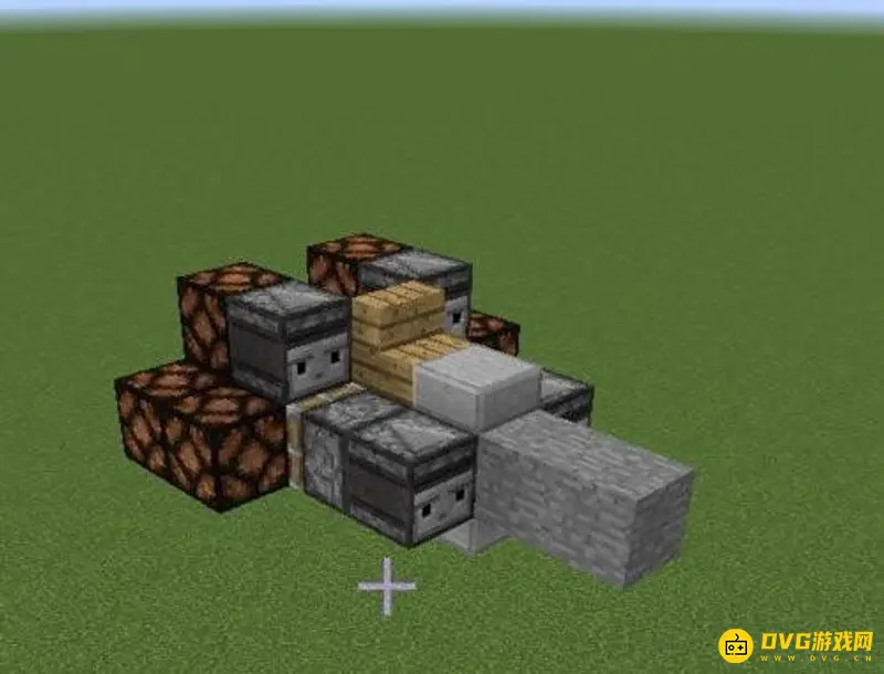 8、作为机头的粘液块前方放两个石头。楼梯前方的粘液块上方放一个半砖。这样红石飞机就做好了。