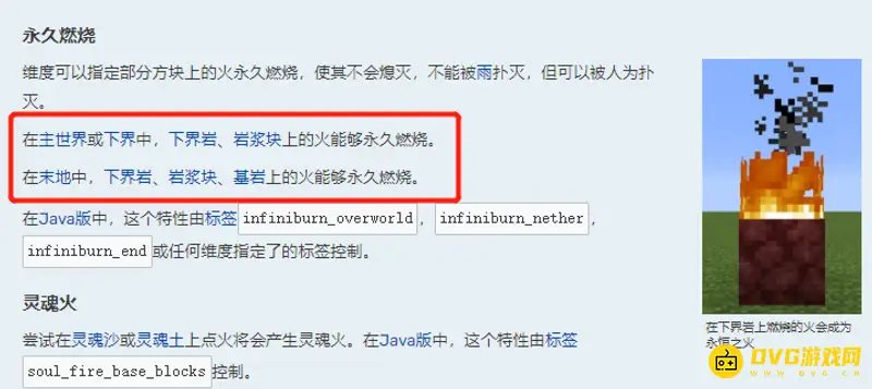 在我的世界在这款游戏里,维度可以指定部分方块上的火永久燃烧,使其不会熄灭,不能被雨扑灭,但可以被人为扑灭。在主世界或下界中,下界岩、岩浆块上的火能够永久燃烧。在末地中,下界岩、岩浆块、基岩上的火能够永久燃烧。
