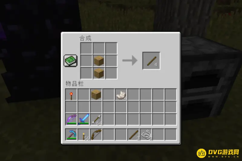2、木棍通过去砍树,木头合成木板,木板合成木棍;