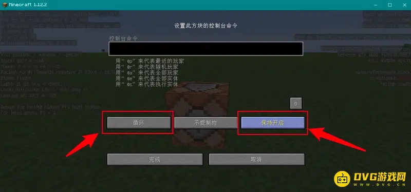 3、记住坐标之后我们需要把,命令方块中两个设置更改一下,如图所示,改为“循环”和“保持开启”。旧版本可能需要使用红石脉冲进行循环激活,这里不再赘述。新版本之后就会方便很多。