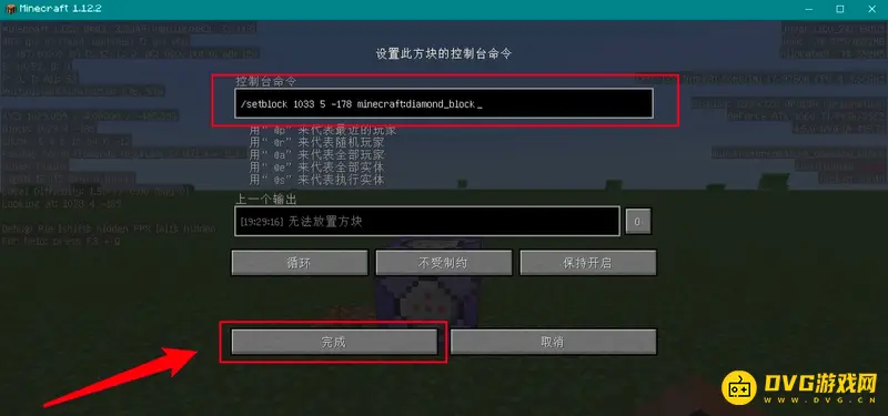 4、然后我们将指令 /setblock x y z block(可以直接复制此指令然后CTRL V粘贴到命令方块中)输入到命令方块之中,最后点击完成即可完成命令方块指令的设置,这里演示的是放置的钻石块。