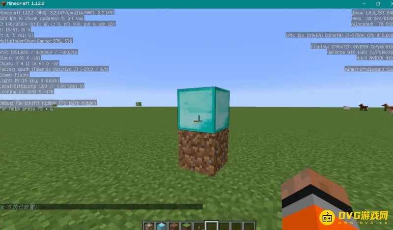 2、然后找到我们想循环刷新物资的位置,这个时候摁住“F3”键然后记下图中所示位置的坐标(如果你是想放置在脚下记得将y轴的坐标向下减一位),可以将这个时候的坐标打在聊天栏中方便查找。