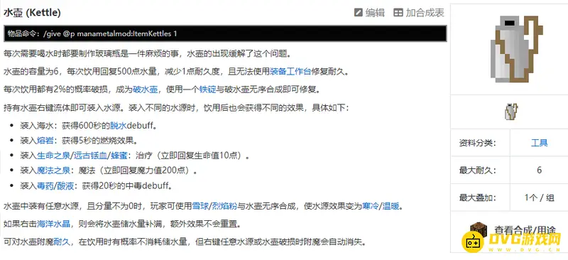右键装水。在游戏中,当玩家持有水壶的时候,可以右键对应的流体,即可装入水源。同时因为装入的流体对象不同,也会出现不同的饮用效果。