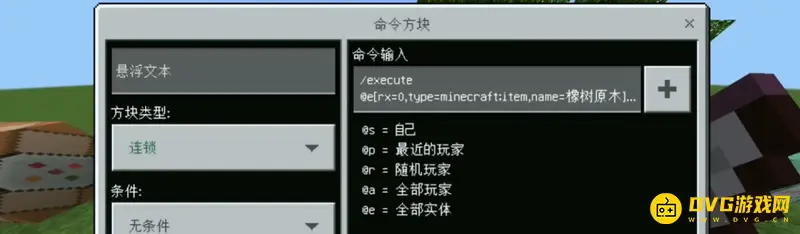 一键砍树指令如下:/execute @e[rx=0,type=minecraft:item,name=橡树原木] ~ ~ ~ detect ~ ~1 ~ log -1 setblock ~ ~1 ~ air 0 destroy。