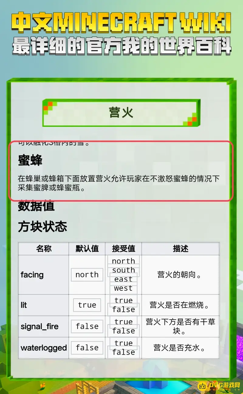 不会杀死蜜蜂,但是会把蜜蜂熏走。在蜂巢或蜂箱下面放置营火允许玩家在不激怒蜜蜂的情况下采集蜜脾或蜂蜜瓶,是玩家用来取蜂蜜的一个方法。