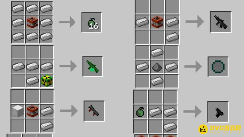 3.除了特定组件道具组装,还有很多可以通过特定的道具合成, 利用铁块以及火药、炸药等,可以通过合成表,合成很多不同类型的火箭筒。