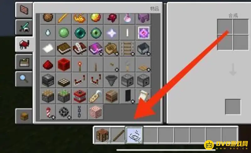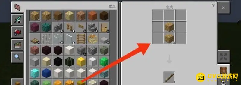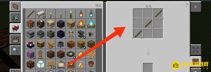 3、收集齐材料后,我们点击工作台,将木棍摆放在第一行第三个位置,第二行第二个位置,第三行第一个位置;
