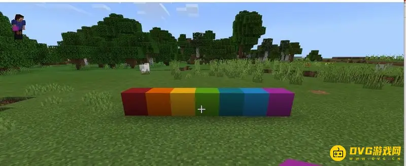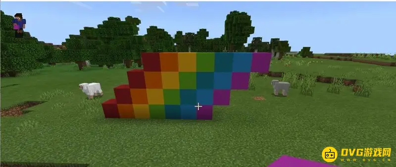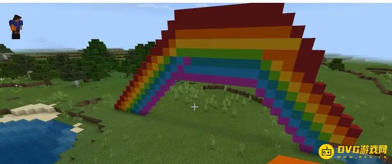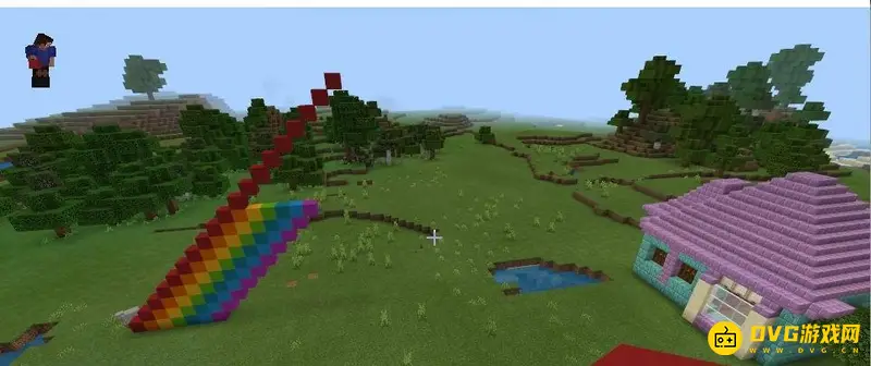 2、然后看一下周围,发现旁边有房子,那就做短一点,往下开始走彩虹,最后就做成彩虹方块了。