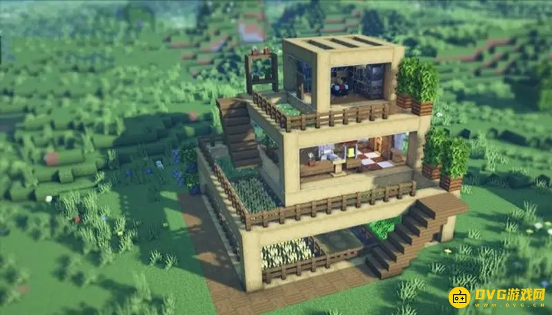 3、火柴盒房。首先底部一个扁平的火柴盒,留出更多的空间用来种植农作物,中间一层的一个中等的火柴盒,用来作为生活区域,顶部一个小的火柴盒,用来放置附魔跟稀有物品,简单又实用,大部分的空间都是镂空或者用玻璃,好看又省力!