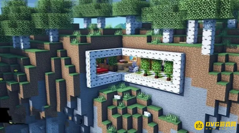 4、悬崖嵌入房。一个万全嵌入悬崖的房间,这种地形在我们探索地图的时候经常能遇到,但却几乎不会多看一下,但是在经过利用跟改造以后,你会发现其实它并没有那么差,甚至还能比平原地形的房子更加的“安全”,毕竟生存模式之下,安全才是第一位的!