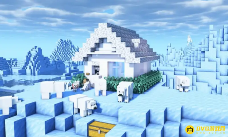 9、雪屋。如何让自己的mc房屋看起来很凉快呢,那无疑是去雪地建造一座房屋。就像图片中一样,增加一些光影,用雪块建造房屋,门前增加一些北极熊来渲染寒冷。