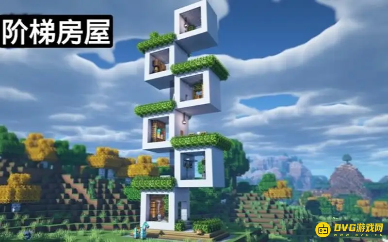 8、阶梯屋。这是一座特别适合多人联机时建造的房屋,它有着很多的房屋。房屋整体为白色,显得十分阳光。每一个小房屋的排列起来就像是一个楼梯