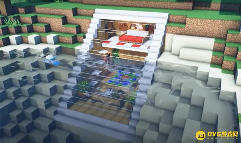 10、水屋。这座房屋则是十方最为推荐的一个房屋,从风格、样式、难易程度上都恰到好处。不会特别复杂,但是感觉又十分良好。首先我们需要找到一个湖泊或者自己建造也可以,在一边挖一个体型的洞穴,洞穴口用玻璃装饰。一半的洞穴浸在水中,一半在外面。屋中则是自己随意装饰,当然你也可以将洞穴分层,一半是水,一半放置物品。这样的房屋,单单看着就跟凉快。