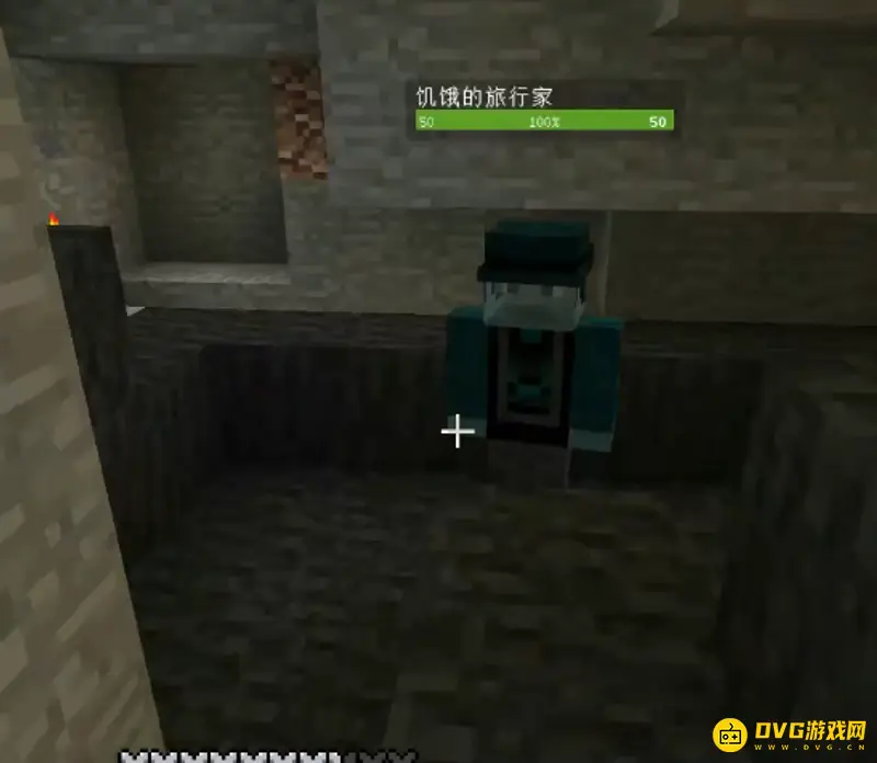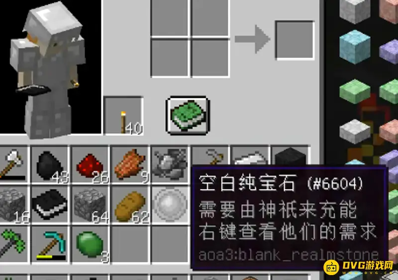 我们在主世界挖矿的时候,可以看到一些破损的传送门遗迹,里面还有一个饥饿的旅行家。这是游戏进行下一阶段--维度冒险的前提,我们需要给旅行家一份食物,然后他会给我们一本黑色的术,右键打开,我们会获得一个空白纯宝石。