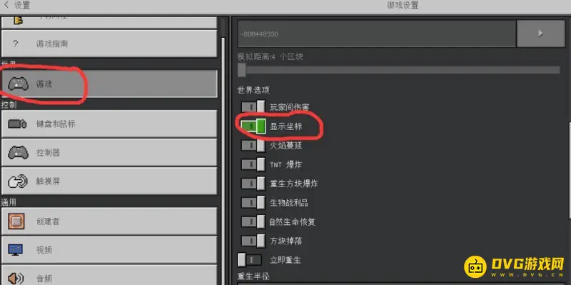 2.然后点击左侧的游戏,在右侧找到显示坐标,把显示坐标打开。