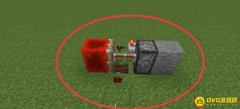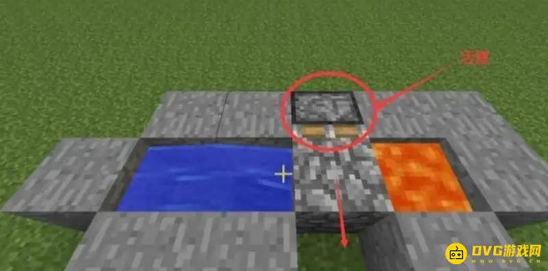 2.然后在中间的缺口处放入活塞推进的位置,对准石头生成的位置,这个就是用来推石头的。
