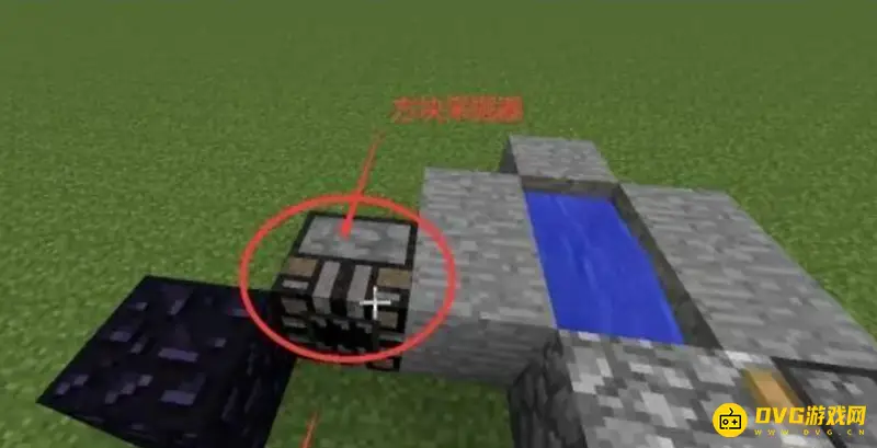 4.在黑曜石和刷石机缺口中间的旁边放置一个方块采掘器,采掘口面朝石料产出方向。