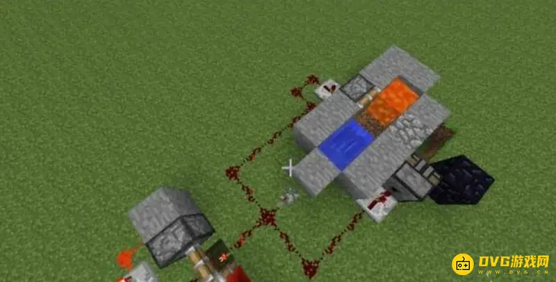 7.最后我们就要使用红石,在刷石机的周围连接上线路,然后在这里放上一个拉杆,这样我们就制作出了一个自动刷石机。