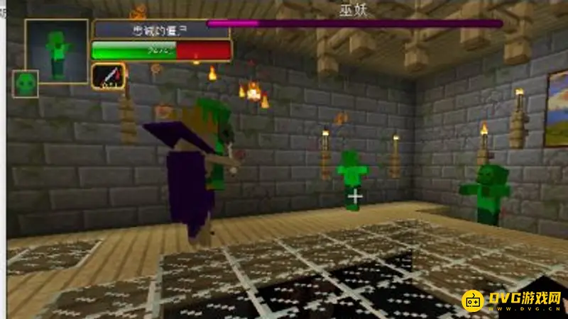 弄掉盾牌之后的巫妖王会进行第二波攻击,利用僵尸法杖,召唤僵尸来进攻我们这时候很麻烦的所以我们可以躲到刚刚进来的楼梯那用一个石块卡住那些僵尸,然后再打清理僵尸!