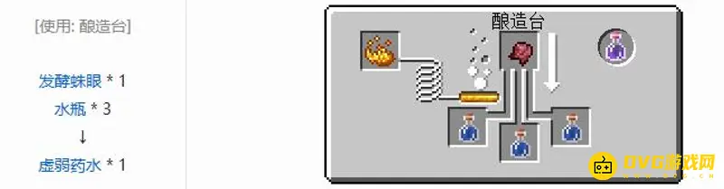 1,发酵蜘蛛眼可以酿造虚弱药水、伤害药水、迟缓药水和隐身药水,虚弱药水的配方为三个水瓶再加一个发酵蜘蛛眼就可以酿造出。