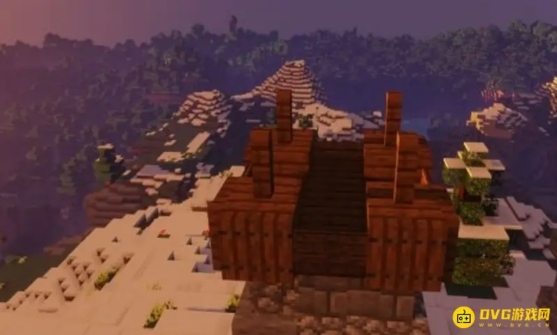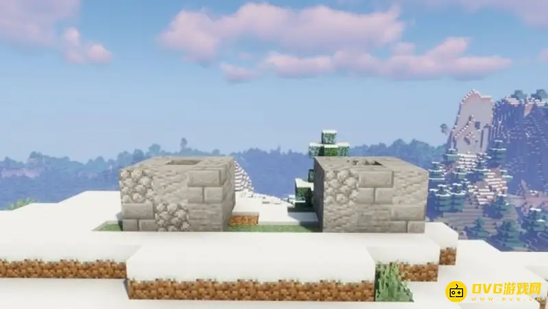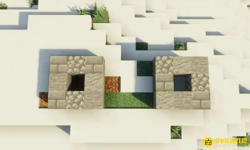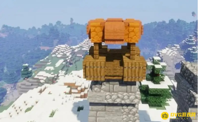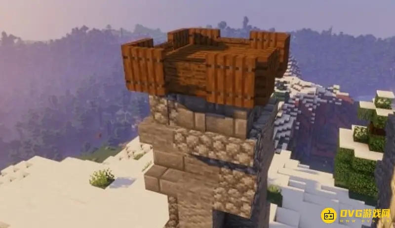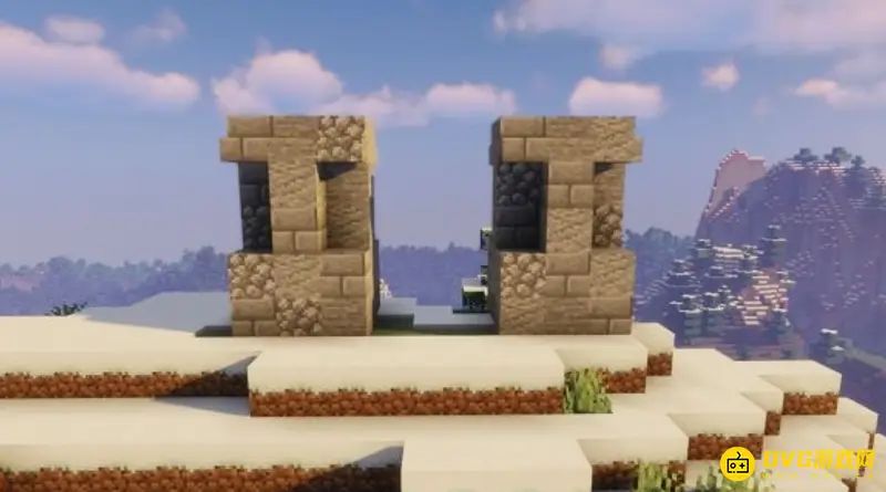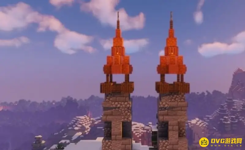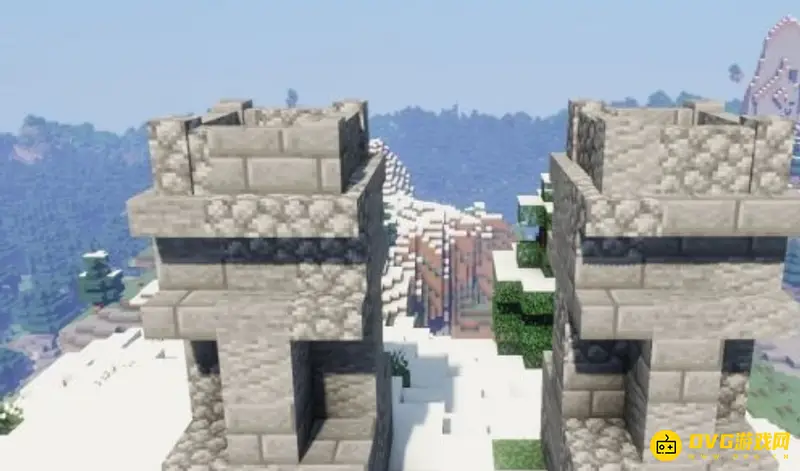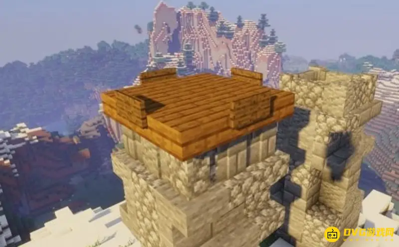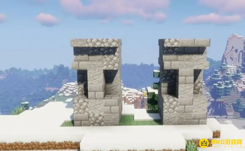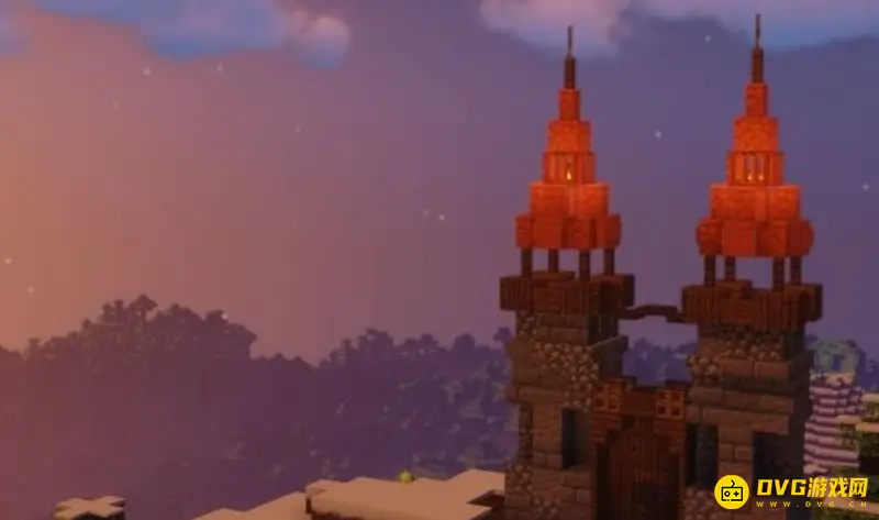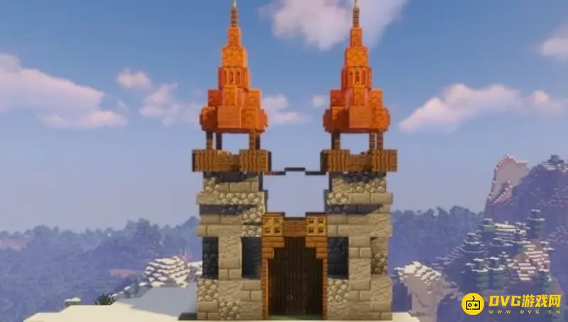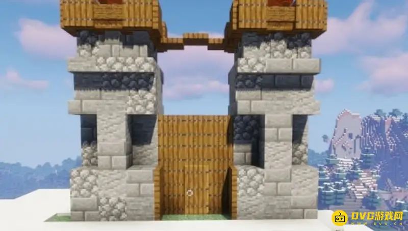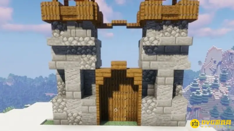 11、然后用云杉木活板门连接两个塔尖,再在石质塔楼间构造门框,最后放入云杉木门