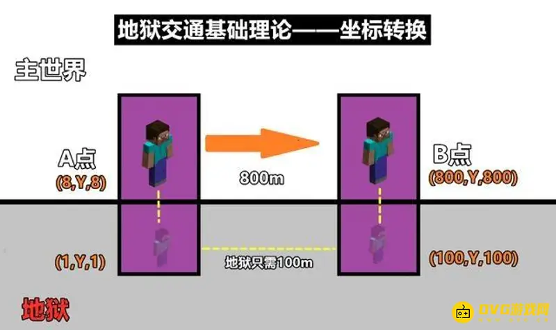 mc的主世界与地狱交通坐标遵循着8:1的水平坐标转换关系,在地狱维度行走1格=在主世界行走了8格。主世界坐标为(X、Y、Z)时,对应地狱坐标就是(X÷8、Y、Z÷8)。