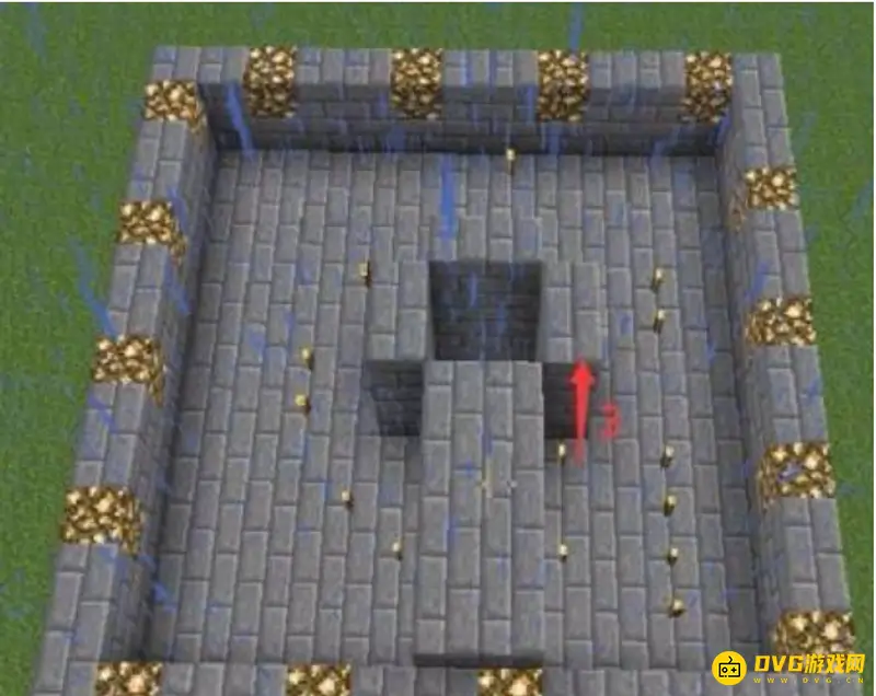 里面插满火把照明,防止刷怪。中间位置提高3格。并且延伸到外围。