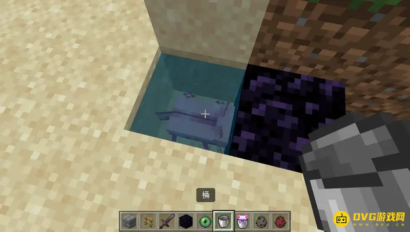 拿着桶对着美西螈,然后按右键就可以装在桶里了。