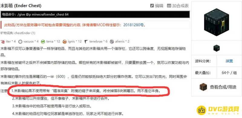 2,然后找到末影箱的相关说明,然后就可以发现只有用带有精准采集的稿子挖末影箱才行。