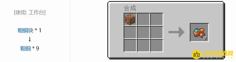 粗铜块可以用来合成粗铜,粗铜块是一种可以储存粗铜的方块。可以在大型铜矿脉中自然生成,不会像其它铜质方块一样氧化,除此之外也没有其他用途了。